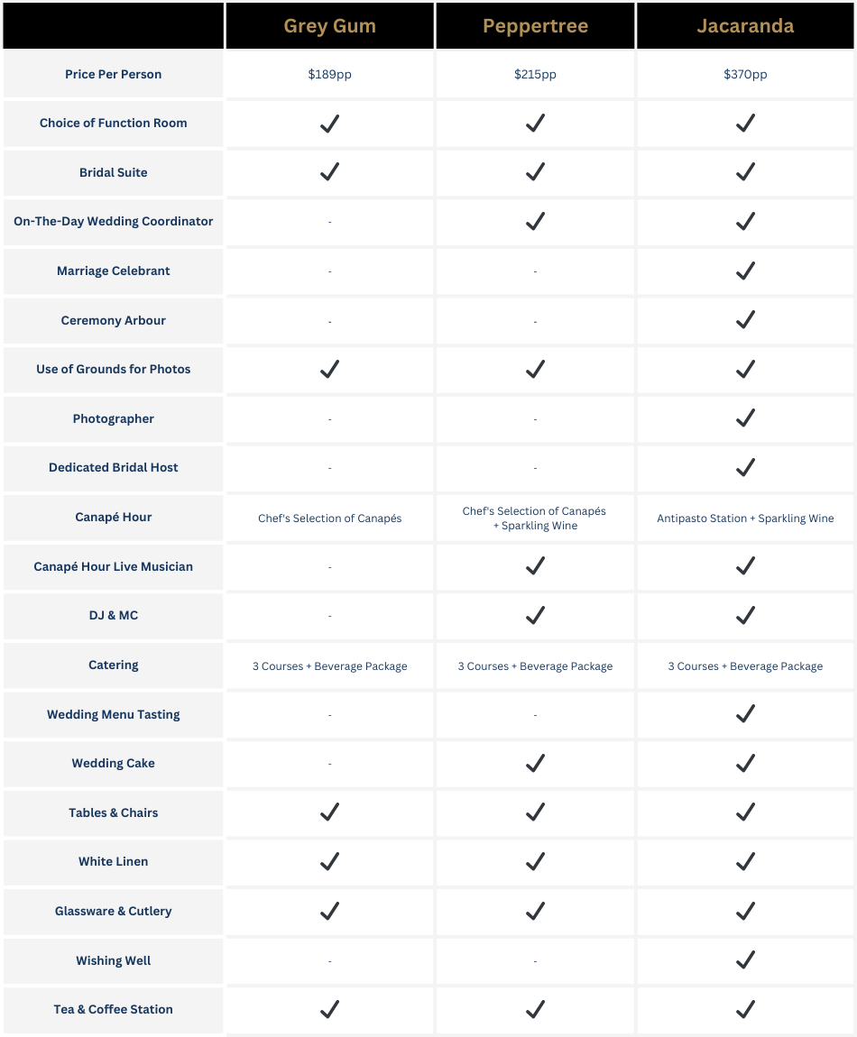 Our standard beverage package does not include spirits, but you can upgrade to the premium beverage package which includes spirits. Gledswood Homestead & Winery is a fully licensed venue and therefore all alcohol must be supplied and served by us. We are happy to work with you to tailor a spirits package for you.